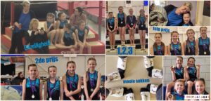 Zaterdag 7 februari reden al vroeg naar Amersfoort voor de eerste voorronde niveau 6 middenbouw. Voor Veenland deden er 2 teams mee. team 1 bestaande uit Sanne, Linne, Isabel en Rosa mochten in de eerste ronde beginnen op balk. Sanne was de hele week ziek geweest maar stond toch op de wedstrijd. Alleen op de balk blijven staan was moeilijk. Ook de andere moesten even in de wedstrijd komen op balk, maar de koprollen gingen allemaal top. Op vloer, sprong en brug ging het uitstekend en ze hadden het zelf niet verwacht maar ze mochten een zilveren medaille in ontvangst nemen. Isabel werd keurig 5de , Linne 6de ,Rosa 13de en Sanne 14de.